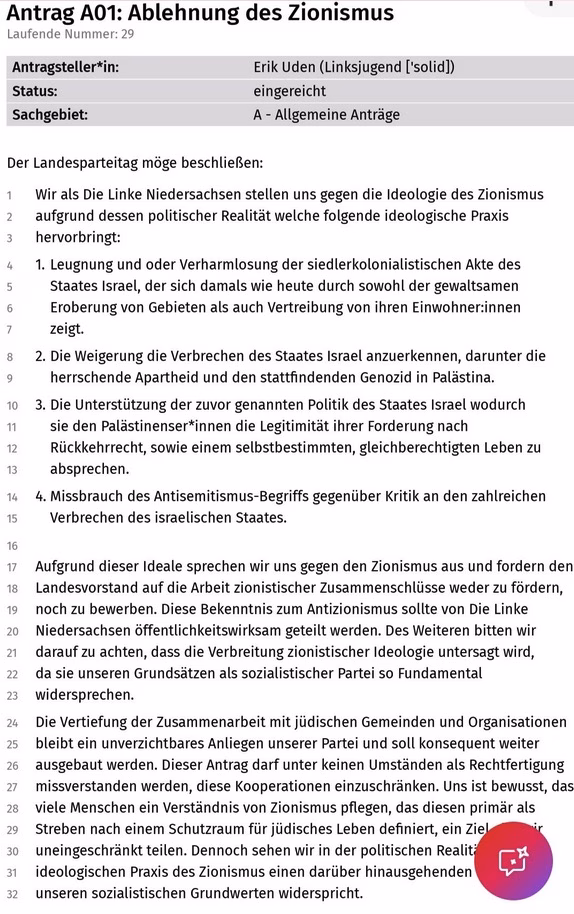 Der Parteitag in Hannover verabschiedete mehrere Anträge, die Israel scharf kritisieren und Begriffe wie „Genozid“ und „Apartheid“ verwenden. Dieser Antrag wurde auf dem Parteitag der Linken Niedersachsen mit 104 von 157 Stimmen angenommen. Anschließend zeigte sich die niedersächsische Linkspartei zufrieden mit ihrem Erfolg. In einem Video, das auf 𝕏 geteilt wurde, heißt es: