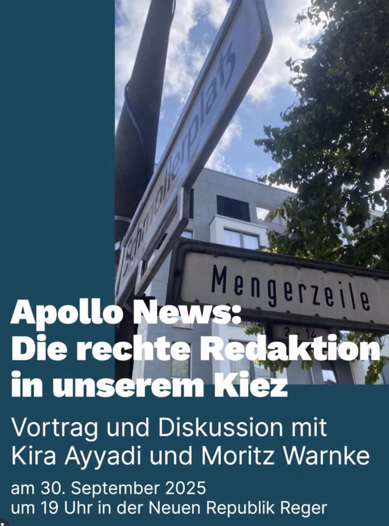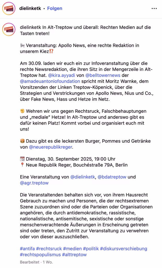 „In der ‚AG Aktiv gegen Apollo-News in Alt-Treptow‘ sind engagierte ‚Antifaschist*innen‘ eingeladen, Ideen für das weitere Vorgehen zu sammeln und gemeinsam gegen Apollo News vorzugehen.“