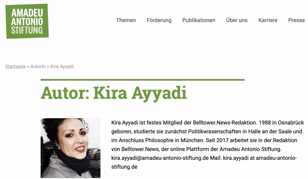 „Kira Ayyadi schreibt als Redakteurin der spendenfinanzierten journalistischen Plattform Belltower.News der Amadeu Antonio Stiftung regelmäßig über Akteure und Strategien rechts-alternativer Medien. […] Als Expertin sprach sie auf der Veranstaltung, um über die Plattform Apollo News aufzuklären und deren Rolle in dieser rechts-alternativen Medienlandschaft einzuordnen. […] Die Amadeu Antonio Stiftung setzt sich mit ihren Mitarbeitenden für eine demokratische Zivilgesellschaft ein, die extremistischem Hass und Desinformation mit Fakten, Aufklärung und Dialog begegnet. Gewalt darf niemals Mittel der politischen Auseinandersetzung sein. Der Schutz der Pressefreiheit wie auch der Menschenwürde sind für die Stiftung unverhandelbare Grundrechte.“