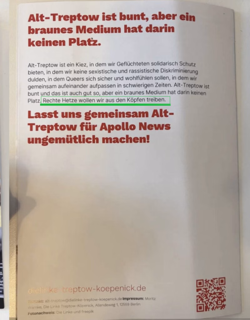 Die Linkspartei in Treptow-Köpenick hat sich nicht lumpen lassen. Auf Flyern, die die Adresse der Apollo-News-Redaktion inklusive Gebäudefoto präsentieren, wird unverhohlen dazu aufgerufen, „rechten Medien auf die Tasten zu treten“ und „Alt-Treptow für Apollo News ungemütlich zu machen“.