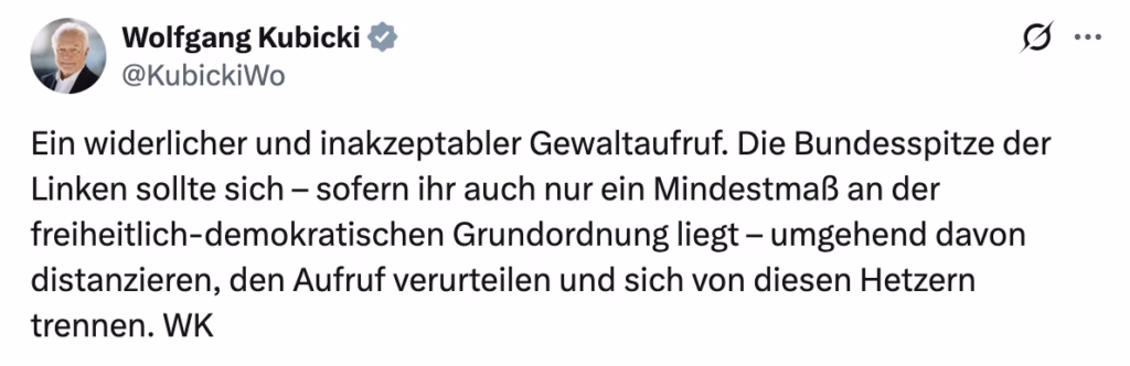 Die Empörung über die Vorgänge bleibt nicht aus. FDP-Politiker Wolfgang Kubicki nennt die Aktionen der Linken einen „widerlichen und inakzeptablen Gewaltaufruf“ und fordert die Bundesspitze der Partei auf, sich „umgehend davon zu distanzieren, den Aufruf zu verurteilen und sich von diesen Hetzern zu trennen“.
