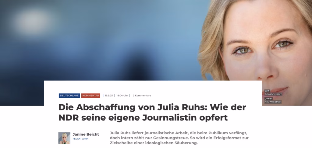 Skandale wie die »Veruntreuungsaffäre um RBB-Chefin Patricia Schlesinger« 2022 oder »die falsche Verdachtsberichterstattung« gegen den Grünen-Politiker Stefan Gelbhaar 2025, die 400.000 Euro Entschädigung kostete, verstärken das Misstrauen. Der Rauswurf von Julia Ruhs, der einzigen nicht-linken Moderatorin der ARD, kurz vor der Verhandlung, heizte die Debatte weiter an. Kritiker sehen darin einen Versuch, die linkslastige Ausrichtung zu kaschieren, der am Widerstand von 250 NDR-Mitarbeitern scheiterte.