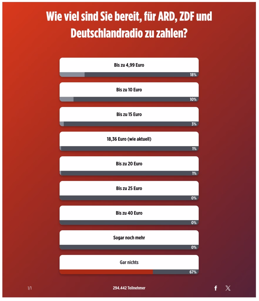 In einer Umfrage der BILD zeigt sich ein deutliches Meinungsbild: Von etwa 295.000 Befragten erklärten 67 Prozent, dass sie nicht mehr bereit sind, eine Gebühr an den öffentlich-rechtlichen Rundfunk zu zahlen.