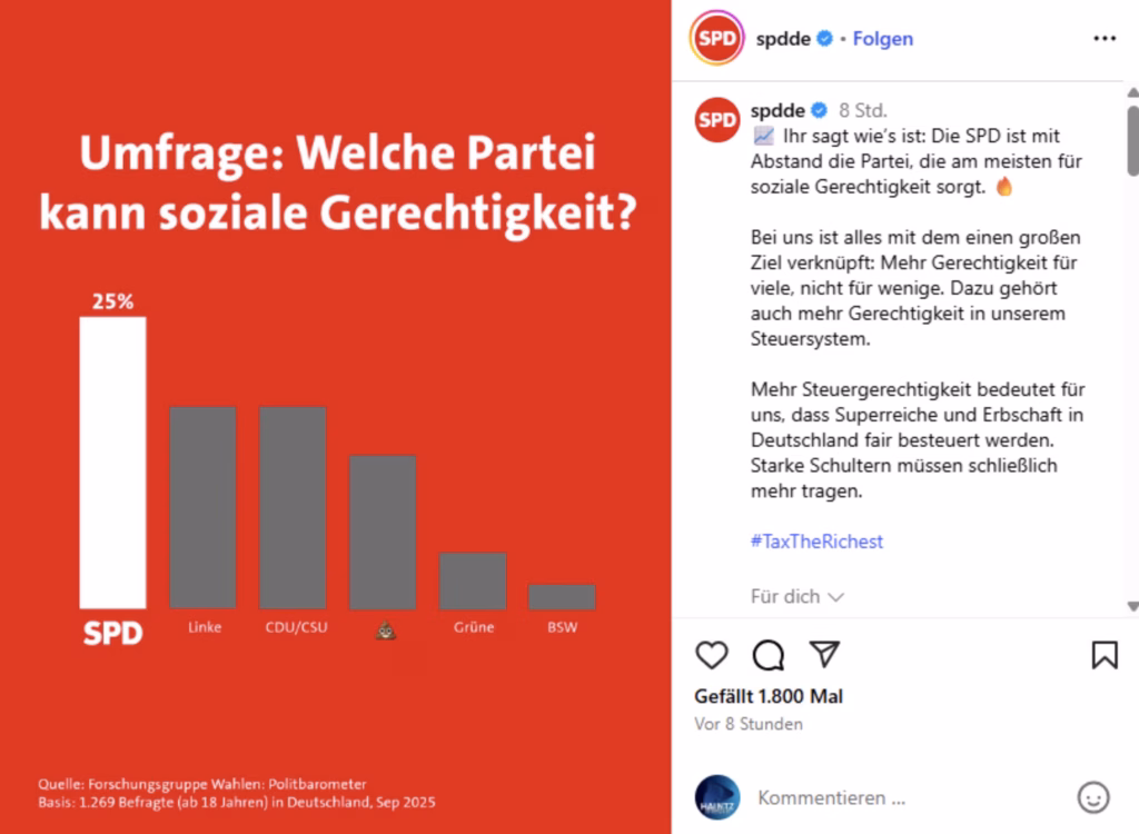 SPD-Organisationen veröffentlichen Diagramme, in denen AfD-Werte mit einem Haufen Kot versehen werden, ohne den Namen explizit zu nennen.