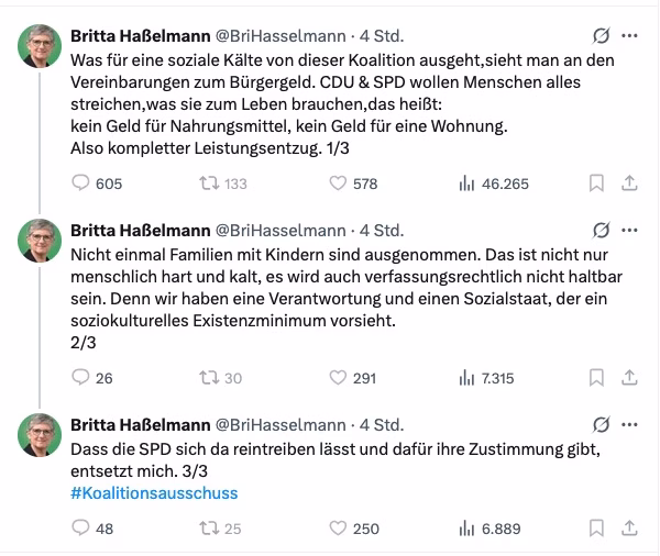 Die Grünen werfen der Koalition „soziale Kälte“ vor. Fraktionschefin Britta Haßelmann kritisierte, dass selbst Familien mit Kindern nicht von den Sanktionen ausgenommen seien, und sieht die verfassungsrechtliche Verpflichtung zum soziokulturellen Existenzminimum gefährdet.