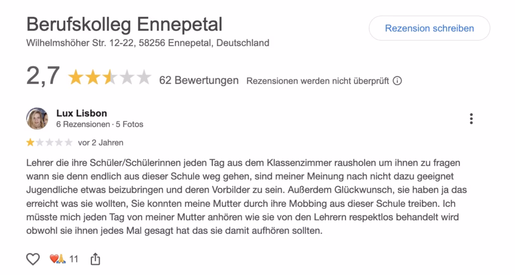 Die Erfahrungen der Mutter decken sich mit zahlreichen öffentlich einsehbaren Google-Rezensionen früherer Schüler. Schüler und Eltern berichten seit Jahren von einem Klima der Angst, der Willkür und der offenen Diskriminierung. Ein ehemaliger Schüler schildert: