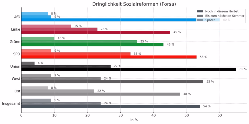 Die Bundesregierung hat Reformen in den sozialen Sicherungssystemen angekündigt, vom Bürgergeld über die Rente bis hin zur Kranken- und Pflegeversicherung. Die Forsa-Umfrage zeigt, dass 54 Prozent der Befragten einen dringenden Reformbedarf sehen und eine schnelle Umsetzung im Herbst fordern. Nur 24 Prozent halten einen Aufschub bis zum nächsten Sommer für vertretbar und lediglich 9 Prozent plädieren für eine noch spätere Umsetzung. Besonders Anhänger der Union drängen auf zügige Reformen, aber auch 45 Prozent der Linken-Anhänger unterstützen eine schnelle Umsetzung.