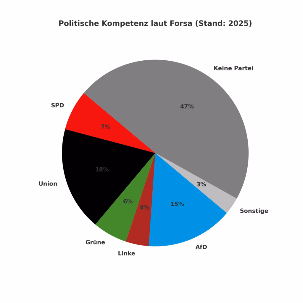 Die Frage nach der politischen Kompetenz offenbart eine wachsende Skepsis in der Bevölkerung. Nur 18 Prozent der Befragten trauen der Union zu, die Probleme Deutschlands zu lösen, ein Rückgang um einen Prozentpunkt. Die SPD fällt von 8 auf 7 Prozent, während die AfD um zwei Punkte auf 15 Prozent zulegt. Die Grünen erreichen 6 Prozent, die Linke 4 Prozent.