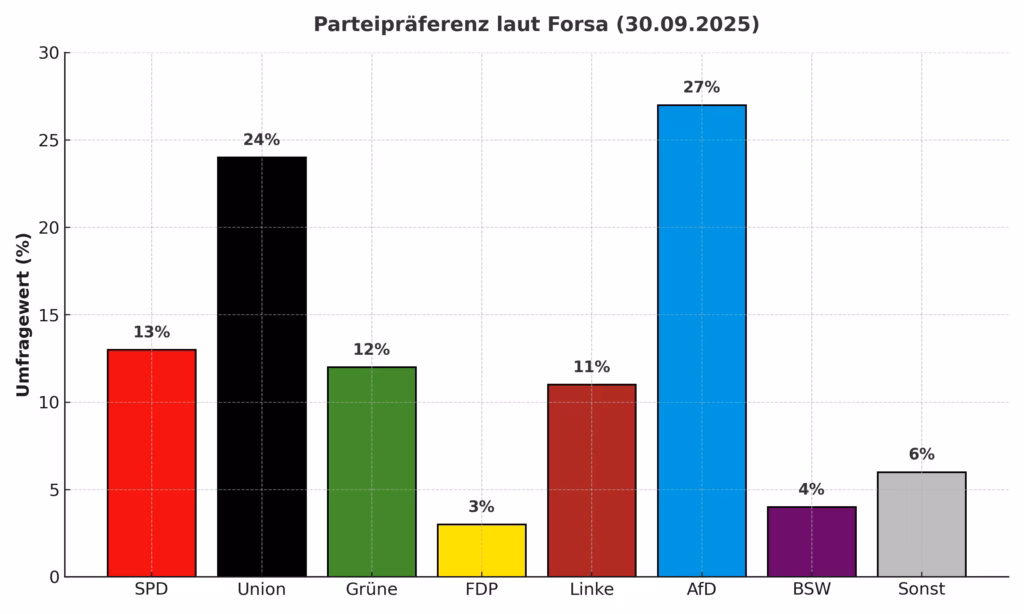 Würde heute gewählt, hätte die schwarz-rote Koalition keine Mehrheit mehr. »Andere Institute« wie INSA und YouGov messen einen geringeren Vorsprung der AfD von einem Prozentpunkt, während die Forschungsgruppe Wahlen beide Parteien gleichauf sieht und Allensbach der Union einen Vorsprung von drei Punkten zuschreibt.