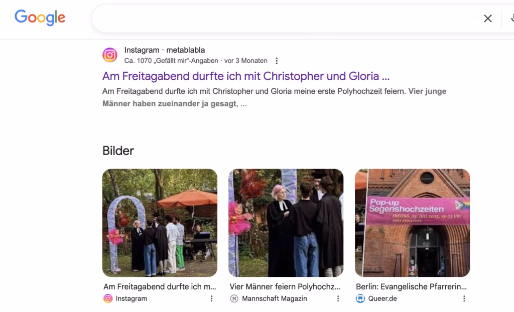 Müller wählt stattdessen „Die Liebe hört nie auf“ »aus 1. Korinther 8 als Bibelvers« für die vier Männer, eine Stelle, die Geduld und Güte lobt, aber keine Mehrfachbeziehungen legitimiert. Ihre Annahme, eine Viel-Ehe sei vor Gott gültig, widerspricht direkt der Schöpfungsordnung. Die vier Männer, die sich teilweise länger kannten und in diesem Jahr polyamor zusammenkamen, zwei aus Lettland, einer aus Thailand, einer aus Spanien, und Englisch sprachen, erhielten von Müller einen Segen, der die monogame Ehe zur lächerlichen Option degradiert. »Sie betont auf Instagram« die „Warmherzigkeit, Großzügigkeit und Offenheit in ihrem Polykül“, als ob emotionale Netzwerke biblische Normen außer Kraft setzen könnten.