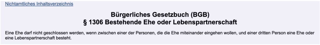 Polygamie verstößt nicht nur gegen das christliche, sondern auch gegen deutsches Recht. Paragraf 1306 BGB verbietet eine Ehe, wenn bereits eine Ehe oder Lebenspartnerschaft mit einer dritten Person besteht.