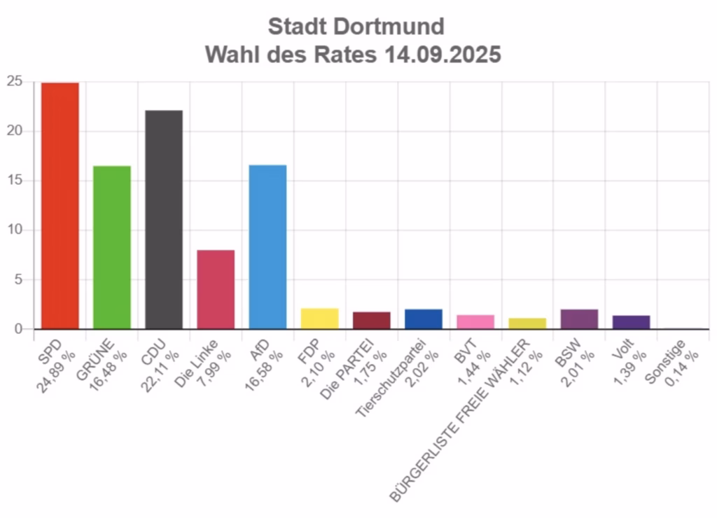 Kaloutis Versprechen, Dortmund zu einer „Modellstadt für Innovation und Zusammenhalt“ zu machen, klingt ambitioniert. Doch die Niederlage der SPD ist mehr als ein lokales Drama. Sie markiert das Zerbröseln der einstigen roten Bastionen im Ruhrgebiet. Bei der Ratswahl erreichte die SPD in Dortmund nur noch 24,89 Prozent, knapp vor der CDU. Die Wähler haben die Partei, die fast acht Jahrzehnte die Stadt dominierte, kalt abserviert.