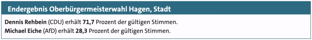 In Duisburg siegt Amtsinhaber »Sören Link« (SPD) mit 78,6 Prozent gegen »Carsten Groß« (AfD), der auf 21,4 Prozent kommt. In Gelsenkirchen setzt sich »Andrea Henze« (SPD) mit 66,9 Prozent gegen »Norbert Emmerich« (AfD, 33,1 Prozent) durch. Und in Hagen gewinnt »Dennis Rehbein« (CDU) mit 71,7 Prozent gegen »Michael Eiche« (AfD, 28,3 Prozent).