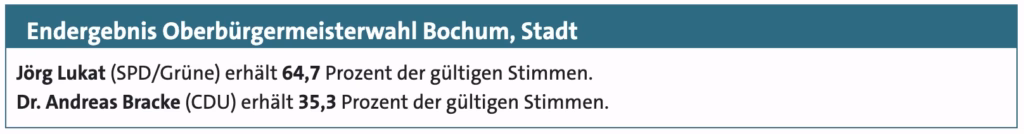 Die CDU hält Essen mit »Thomas Kufen«, (57,1 Prozent) und Paderborn, während die SPD Krefeld, Mönchengladbach und Wuppertal verteidigt. Letzteres ist ein symbolischer Sieg, da Wuppertal die Heimatstadt des SPD-Größe Johannes Rau ist. In Bochum gewinnt »Jörg Lukat« (SPD/Grüne) mit 64,7 Prozent gegen »Andreas Bracke« (CDU). »In Heek im Münsterland« siegt der parteilose »Michael Averbeck« mit 51,6 Prozent gegen »Jürgen Lammers«, eine Wahl ohne Parteien, die zeigt, dass lokale Politik auch ohne großes Parteibuch funktionieren kann.