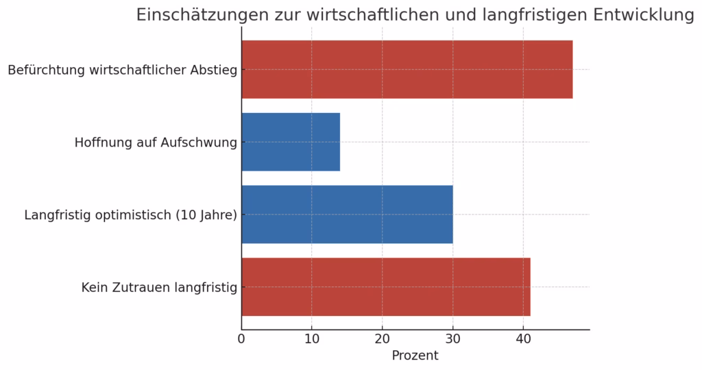 Fünf Jahre Ausnahmezustand haben die Bevölkerung zermürbt: Grundrechtseinschränkungen, Ukraine-Russlandkonflikt, Energieengpässe, Rekordinflation, wirtschaftliche Stagnation, »Protektionismus« und geopolitische Spannungen zerstören jedes Gefühl von Sicherheit. Die Mehrheit rechnet nicht mit einer Rückkehr zu stabilen Zeiten, Befürchtungen eines wirtschaftlichen Abstiegs klettern von 33 Prozent im Juni auf 47 Prozent, während nur 14 Prozent auf Aufschwung hoffen. Längerfristig optimistisch für die nächsten zehn Jahre sind lediglich 30 Prozent, 41 Prozent fehlen jegliches Zutrauen.