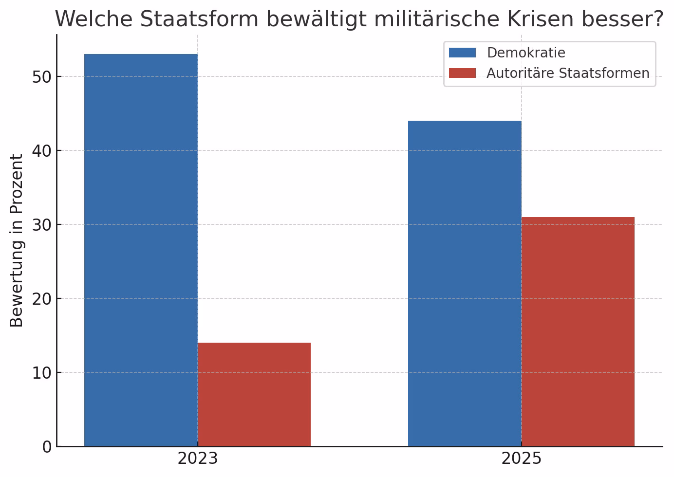 Besonders in militärischen Krisen und Pandemien entpuppte sich das aktuelle System als unfähig. Im Jahr 2023 glaubten noch 53 Prozent, Demokratien bewältigten militärische Konflikte besser als autoritäre Regime, heute sind es nur 44 Prozent, während der Anteil jener, die autoritären Systemen mehr Kompetenz zusprechen, von 14 auf 31 Prozent explodiert.