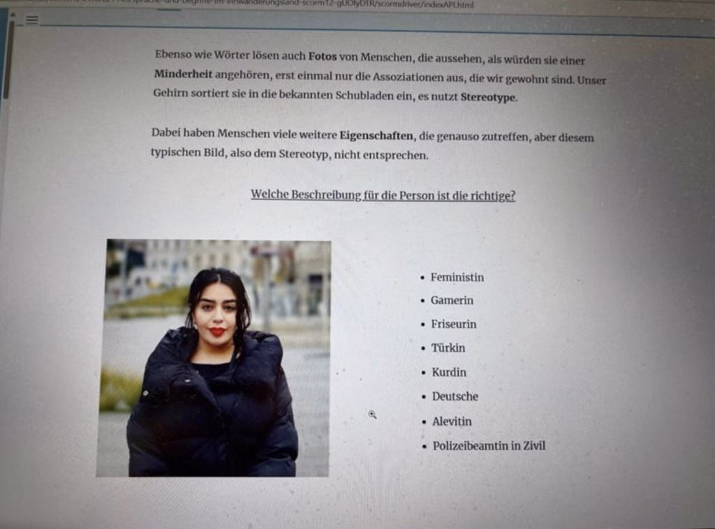 In Multiple-Choice-Tests gelten solche Alternativen als korrekt, stigmatisierende Varianten als falsch. Ein Quiz zu einem Messerangriff in Nürnberg fragt, ob die syrische Herkunft des Täters genannt werden dürfe, die Antwort lautet natürlich nein, da das Motiv unbekannt sei und dies nur Vorurteile schüre. Fotos von Personen, etwa einer jungen Frau mit Migrationshintergrund, dienen dazu, Klischees zu zerpflücken: Sie könnte schließlich auch eine Feministin, Gamerin, Friseurin oder Polizeibeamtin in Zivil sein, alles außer dem Offensichtlichen wie Türkin oder Kurdin, weil das Gehirn angeblich in Schubladen sortiere und viele Eigenschaften dem Stereotyp widersprächen.