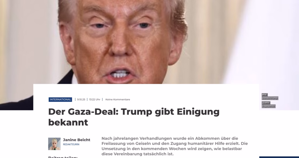 International wird der Deal mit einer »„Nahost-Friedenszeremonie“ in Sharm El-Sheikh gefeiert«, an der über 20 Staats- und Regierungschefs, darunter Bundeskanzler Friedrich Merz, teilnehmen. Deutschland hat zugesagt, »den Wiederaufbau in Gaza zu unterstützen«. Doch die Zeremonie wirkt wie ein symbolischer Akt, während die Kernkonflikte, nämlich die Entwaffnung der Hamas, der vollständige Rückzug Israels und die Frage nach langfristiger Sicherheit, ungelöst bleiben.