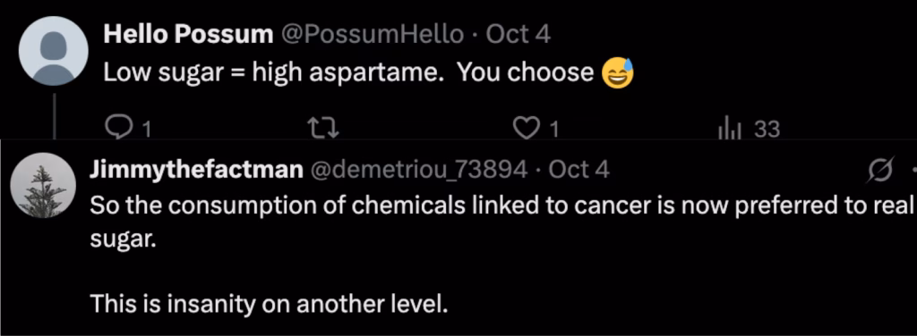 „Also bekommt der Verzehr von Chemikalien, die mit Krebs assoziiert werden, Vorrang vor echtem Zucker. Das ist Wahnsinn auf einem anderen Niveau.“