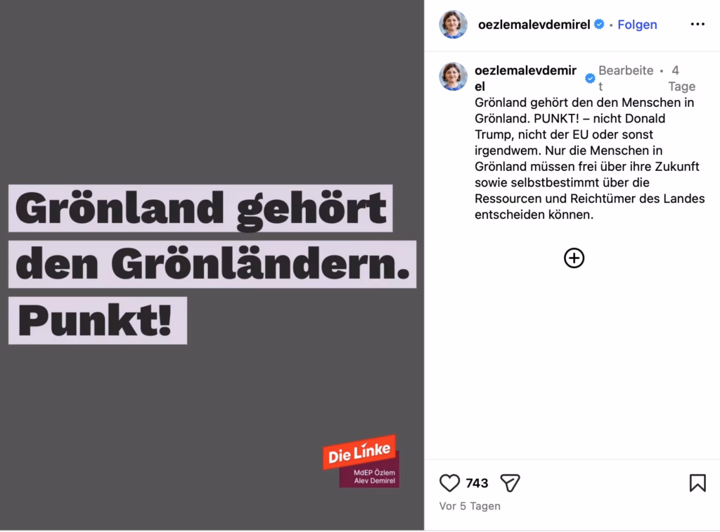 Demirel verdeutlicht „Grönland gehört den Grönländern. PUNKT! – nicht Donald Trump, nicht der EU oder sonst irgendwem. Nur die Menschen in Grönland müssen frei über ihre Zukunft sowie selbstbestimmt über die Ressourcen und Reichtümer des Landes entscheiden können.“