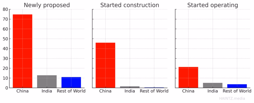 Während Europa deindustrialisiert wird, bauen China und Indien aus: »Beide Länder machen im Jahr 2025« bisher 87% der neuen Kohlekraftkapazitäten aus, investieren in Kernkraft und erneuerbare Energien nur, wo es marktwirtschaftlich sinnvoll ist. Laut der folgenden Grafik wurden im ersten Halbjahr 2025 in China rund 74,7 GW und in Indien 12,8 GW an neuen Kohleprojekten vorgeschlagen, während der Rest der Welt zusammen lediglich auf etwa 11 GW kam.