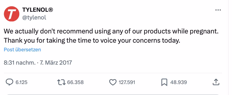 Dass ein Studiendesign auch durch die Auftraggeber beeinflusst ist, muss man im Hinterkopf behalten. In dieser Frage überschlagen sich die – natürlich gesteuerten – Suchergebnisse darin, Trumps Behauptung lächerlich zu machen und zu widerlegen. Auch auf TikTok und Twitter äußern Ärzte, wie falsch Trump liege. Wenn es aber klar ist, dass die Lage nicht eindeutig ist und schlimme Nebenwirkungen möglich sind, dann ist es kein Akt von Arroganz, Anmaßung oder unnötigem Konfrontationskurs von Trumps Gesundheitsstab, Schwangere zu warnen, sondern einer der Nächsten- und Bürgerliebe.