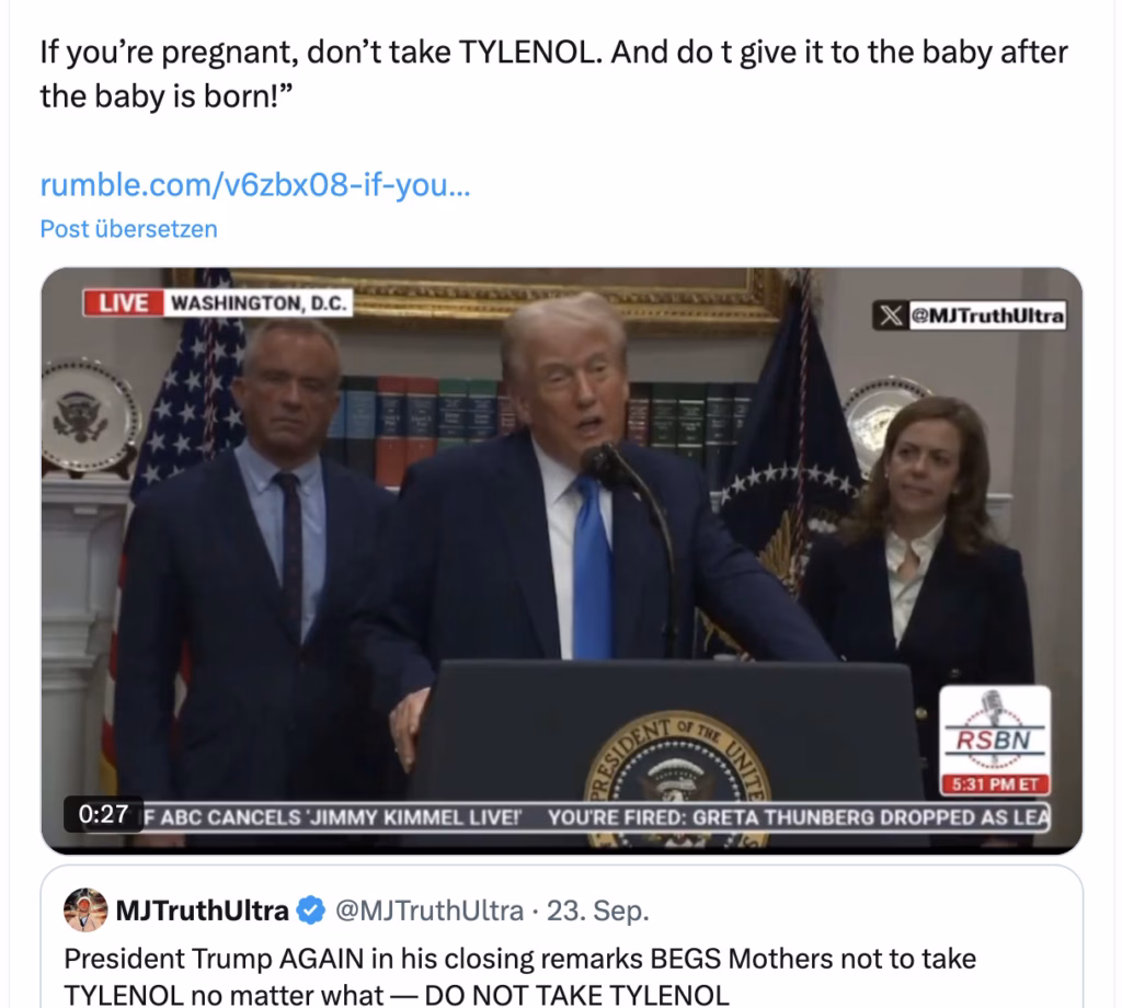 »Trump warnte Schwangere davor«, Paracetamol, in den USA Acetaminophen genannt, den Wirkstoff im Präparat Tylenol®, zu nehmen. Selbst wenn Schwangere sich schlecht fühlten und es eine harte Zeit mit Kopf- und Gliederschmerzen werde, sollten sie durchhalten, ohne das Mittel zu nehmen: