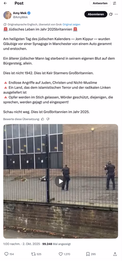 Am 2. Oktober 2025, dem höchsten jüdischen Feiertag Jom Kippur, wurde die Heaton-Park-Synagoge in Crumpsall, Manchester, zum Ziel eines brutalen Anschlags. Ein Mann, bewaffnet mit einem Messer und einer Weste, die wie ein Sprengstoffgürtel aussah, raste mit einem Auto in eine Menschenmenge und stach auf Passanten ein. »WeLT berichtet«: Zwei Mitglieder der jüdischen Gemeinde starben, drei weitere schweben in Lebensgefahr, vier weitere Menschen sind schwer verletzt. Die Polizei erschoss den Angreifer, der vermutlich alleine handelte, und nahm zwei weitere Verdächtige fest. Doch während Politiker mit hohlen Phrasen reagieren, bleibt die Frage, warum jüdische Gemeinden in Großbritannien immer wieder in Angst leben müssen. Die Behörden schweigen zu den Hintergründen, und die Öffentlichkeit tappt im Dunkeln.