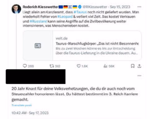 Die nachfolgende Passage wurde abgemahnt: „Du hättest bestimmt im 3. Reich Karriere gemacht“, bezogen auf den Kontext, dass Kiesewetter Taurus-Marschflugkörper für die Ukraine gefordert hat.