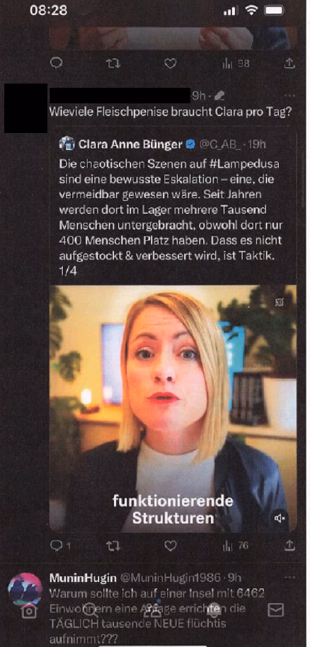Sein Mandant, Herr M., habe in dem beanstandeten Kommentar lediglich die Frage aufgeworfen, wie viele schwarzafrikanische Männer Frau Bünger pro Tag im weltweit als Flüchtlingsinsel berüchtigten Lampedusa denn ankommen sehen möchte.