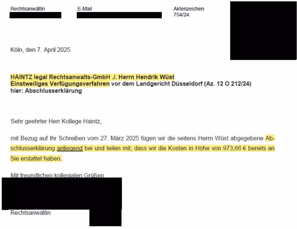 Am 07. April 2025 hat die Anwältin von NRW-Ministerpräsident Wüst in seinem Namen eine Abschlusserklärung im einstweiligen Verfügungsverfahren gegenüber der Haintz legal Rechtsanwalts-GmbH abgegeben.