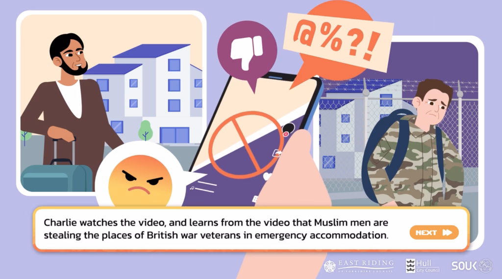 Charlie begegnet Charakteren wie auch Amelia, einer fiktiven rechtsextremen Antagonistin. Der Spieler soll lernen, Warnsignale für Radikalisierung zu erkennen, etwa wenn die Figur gegen Massenmigration und für traditionelle britische Werte eintritt.