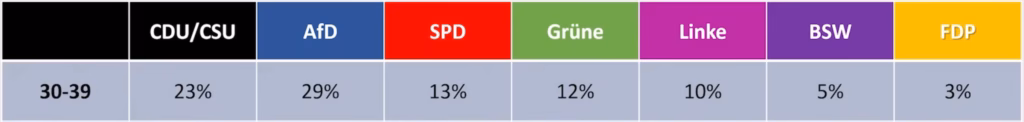 Bei den 30- bis 39-Jährigen kippt die Fassade der Macht vollends. Die AfD erreicht 29 Prozent und zerlegt das verstaubte Ritual der Sonntagsreden. Diese Generation steht mitten im Leben, arbeitet, zahlt, schuftet und erkennt, dass sie das Rückgrat des Systems ist, aber dafür behandelt wird wie ein lästiger Kostenfaktor. CDU, SPD und Grüne liefern nur noch ideologische Dekoration für eine Realität, die sie nicht begreifen.