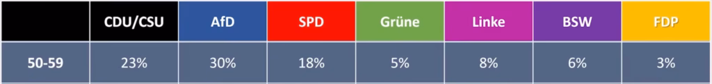 In der Altersgruppe der 40- bis 49-Jährigen explodiert der Frust. 32 Prozent AfD, ein Schlag ins Gesicht der Selbstzufriedenen. Diese Generation ist die tragende Säule der Gesellschaft, denn sie zahlt Steuern, erzieht Kinder, trägt Verantwortung. Und sie sieht zu, wie ein politischer Apparat ihr Geld in moralische Kampagnen und ideologische Symbolpolitik versenkt.