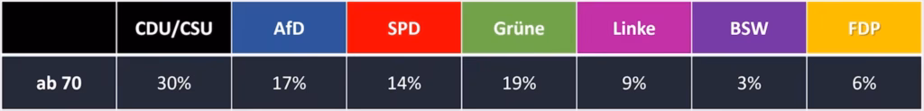 Bei den 60- bis 69-Jährigen versucht die Union, ihre letzte Bastion zu verteidigen. 27 Prozent für die CDU/CSU, dicht gefolgt von der AfD mit 25 Prozent. Das ist kein Stabilitätsbeweis, sondern ein Warnsignal. Selbst die Generation, die jahrzehntelang brav das Kreuz bei den sogenannten Volksparteien machte, verliert die Geduld.